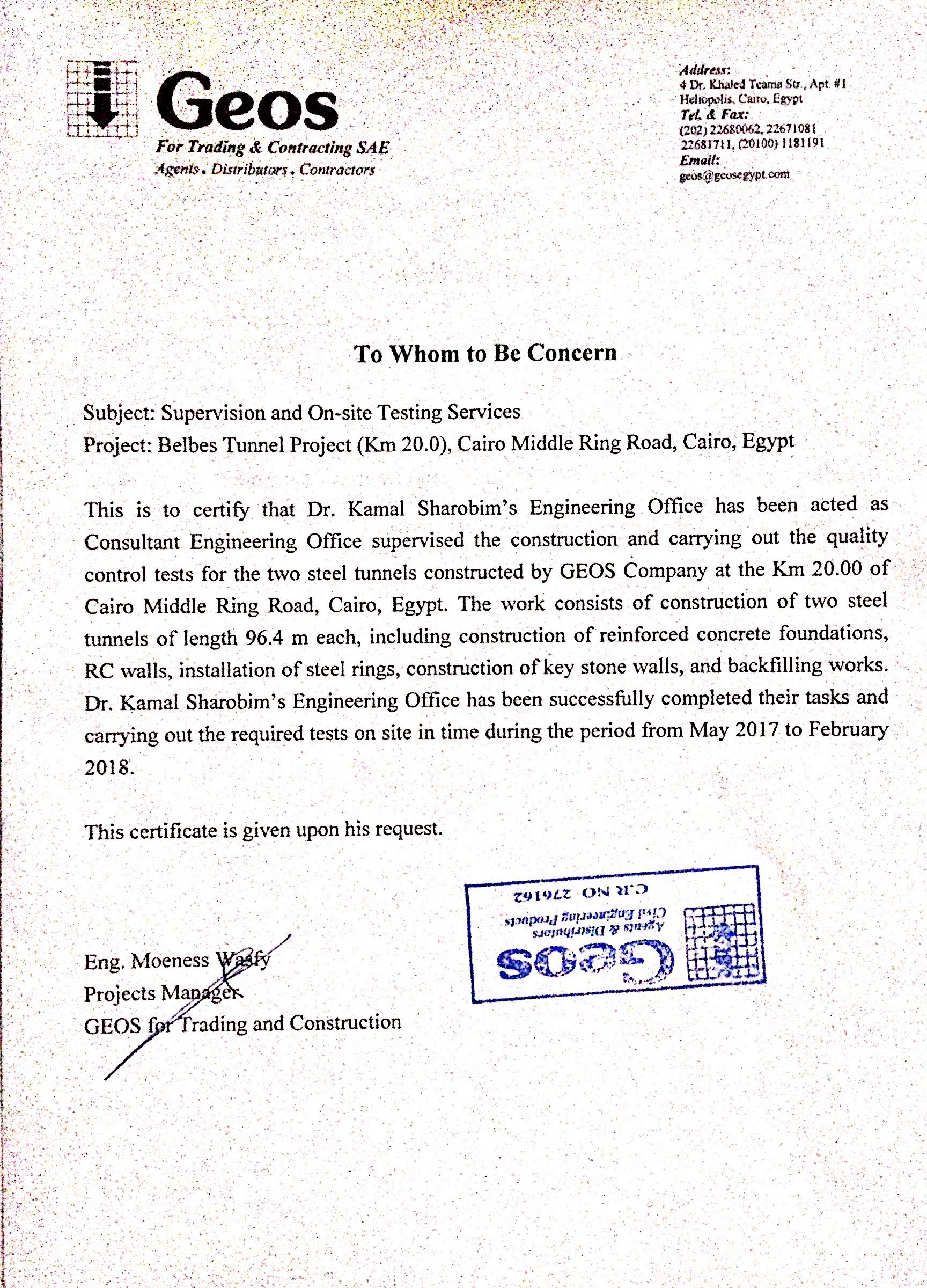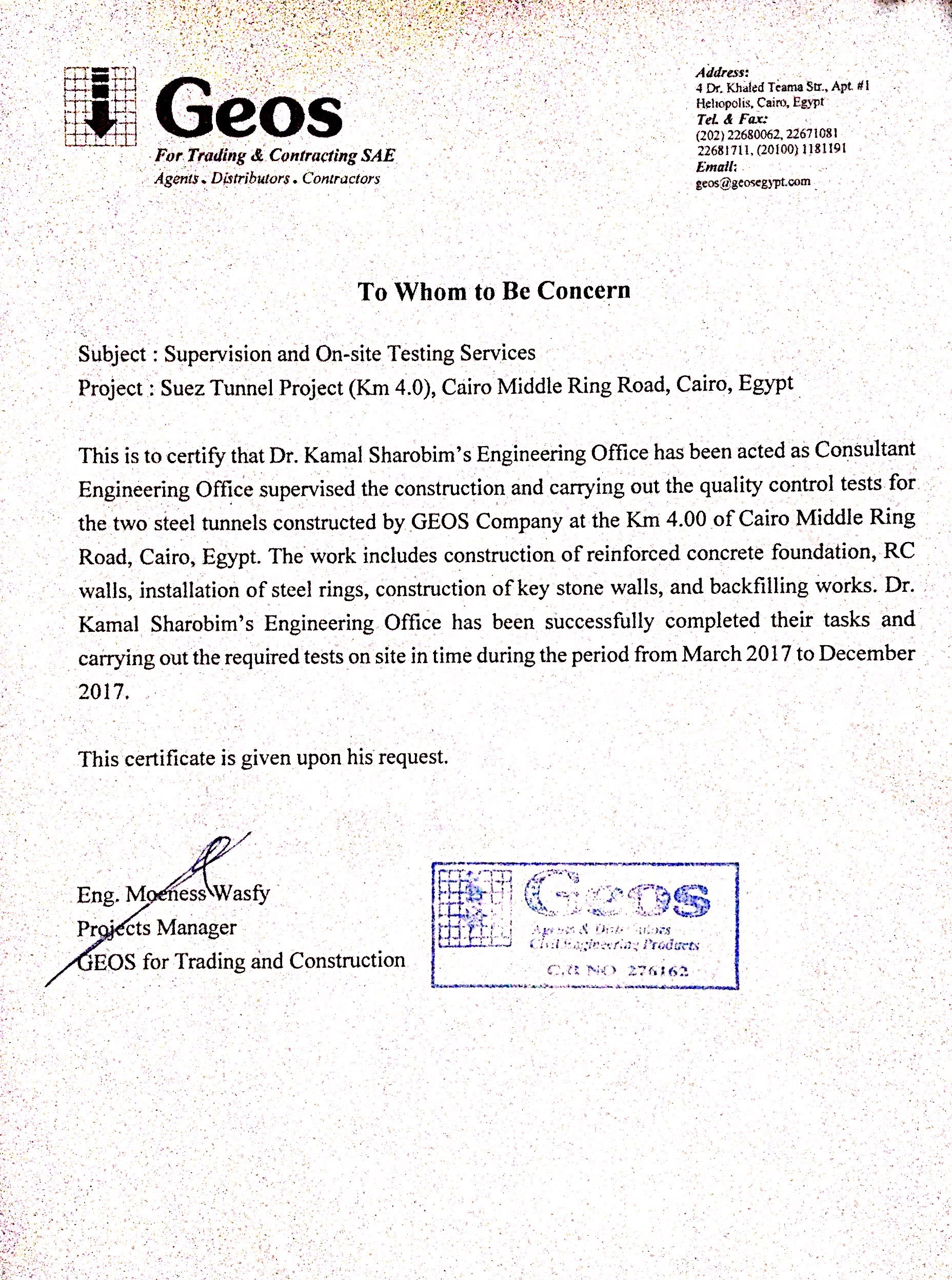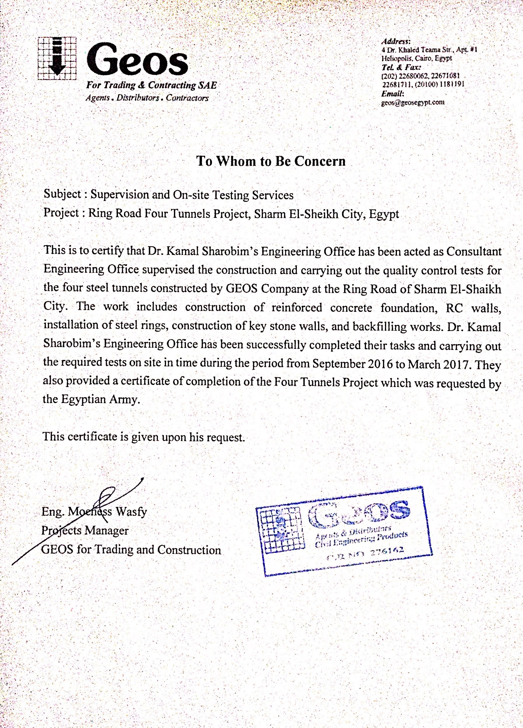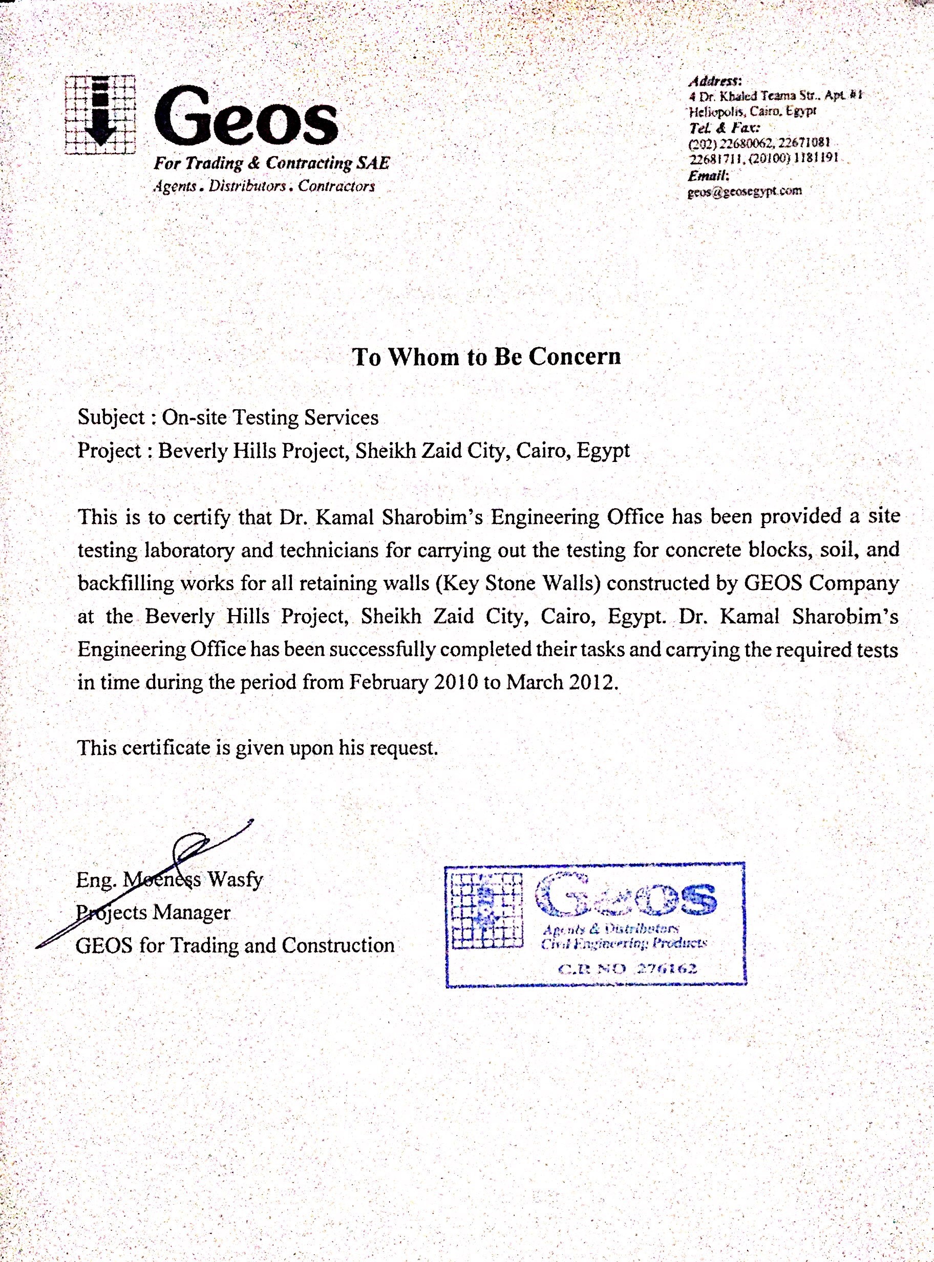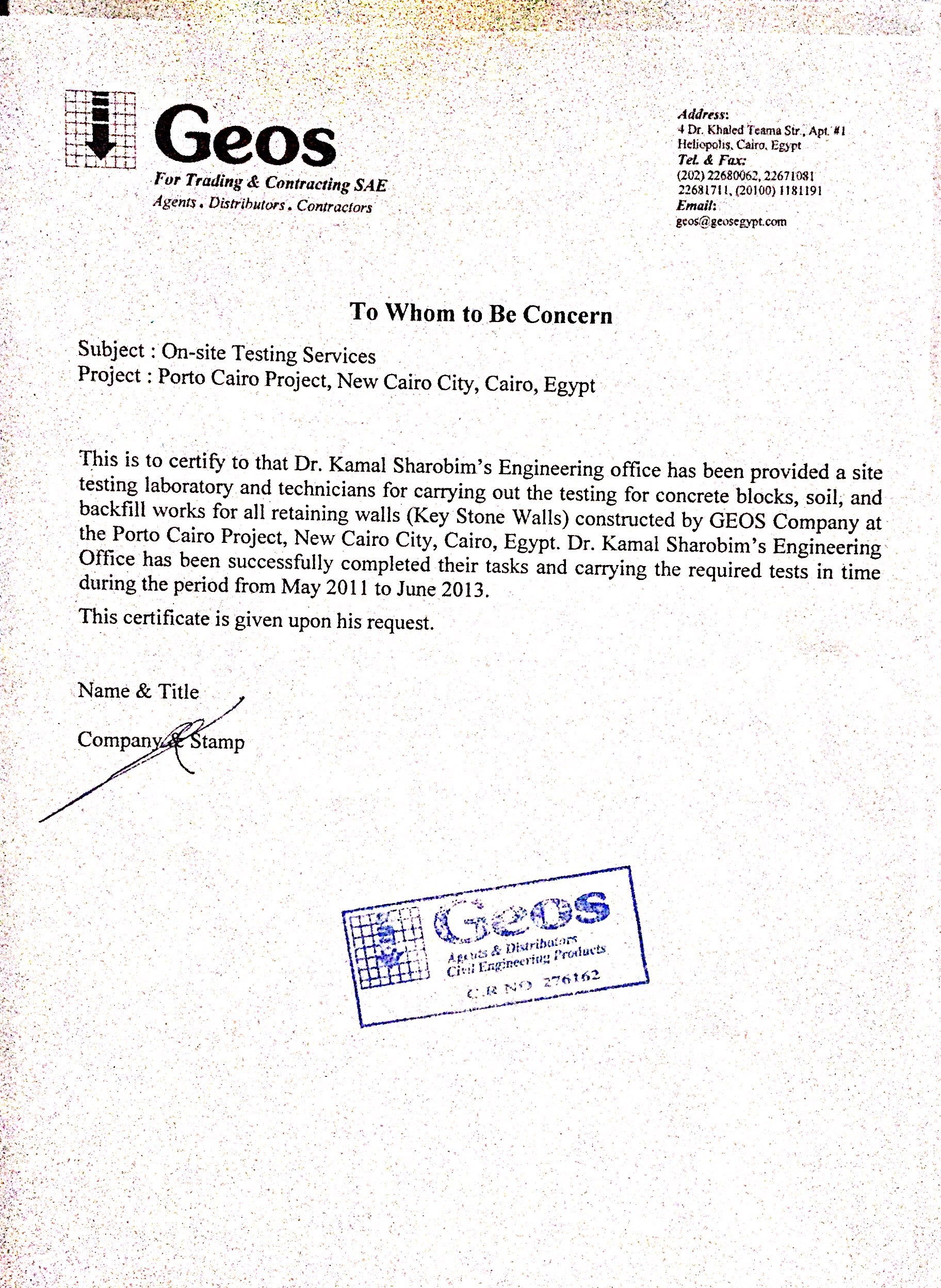 Dr. Kamal Sharobim's Engineering office had a contract with Geos for Trading and Contracting to carry out the testing for all civil works including excavation, backfilling works, concrete works for retaining walls, and keystone walls. All tests for construction materials were carried out by our staff and in our laboratories during the period from May 2011 to June 2013.