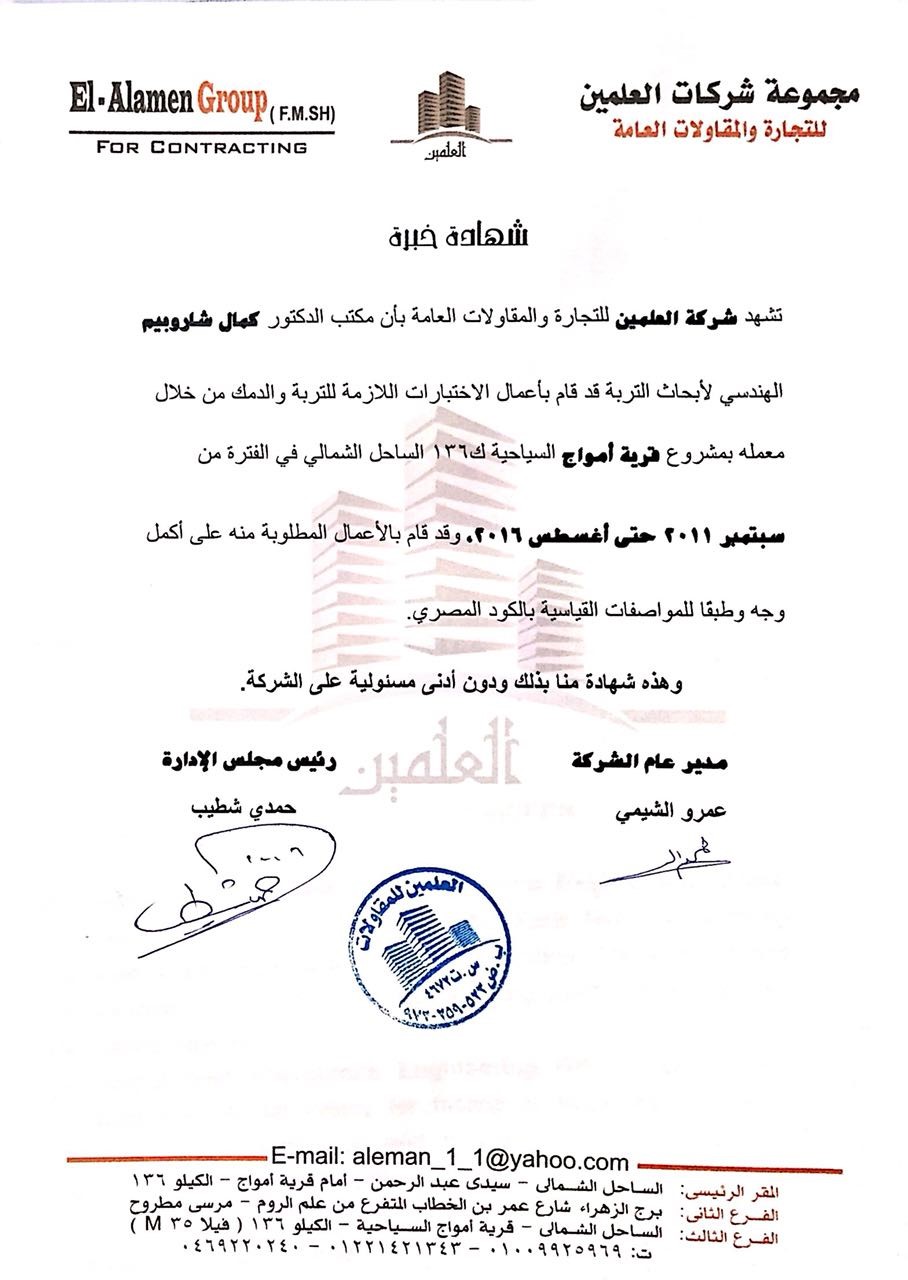 Dr. Kamal Sharobim's Engineering office works with Al-Ahly Real Estate Development company and El-Alamen Group Contracting Company from September 2011 to August 2016 to carry out all required quality control tests through the site laboratory for 60 months. The on-site tests for all civil engineering works including excavation, backfilling works, concrete works, brick works, internal roads and asphalt works were carried out at our on-site laboratory, however off-site tests were carried out at our central laboratory at 6 of October City.