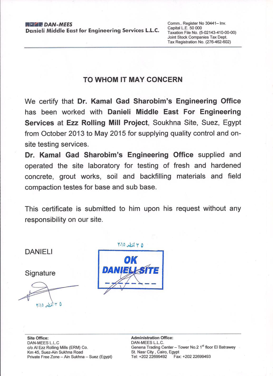 Dr. Kamal Sharobim's Engineering office had a contract with Danieli middle east for engineering services to provide and operate the on-site testing laboratory to carry out all required quality control tests for 20 months from October 2013 to May 2015. The on-site tests for all civil engineering works including excavation, backfilling works, concrete works, brick works, internal roads and asphalt works were carried out at our on-site laboratory, however off-site tests were carried out at our central laboratory at 6 of October City.